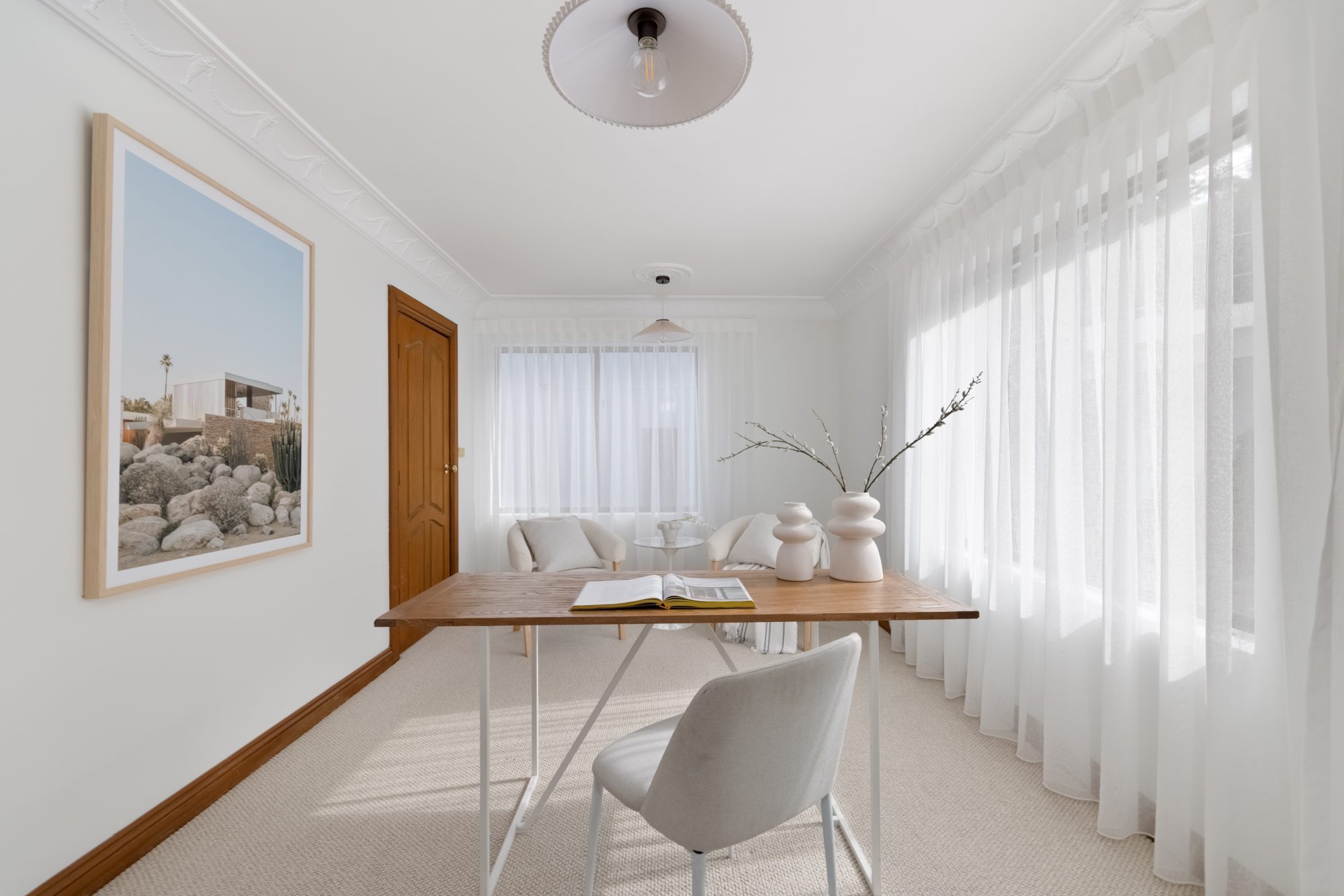Unique ceiling and wall detailing, ornate turned timber staircase