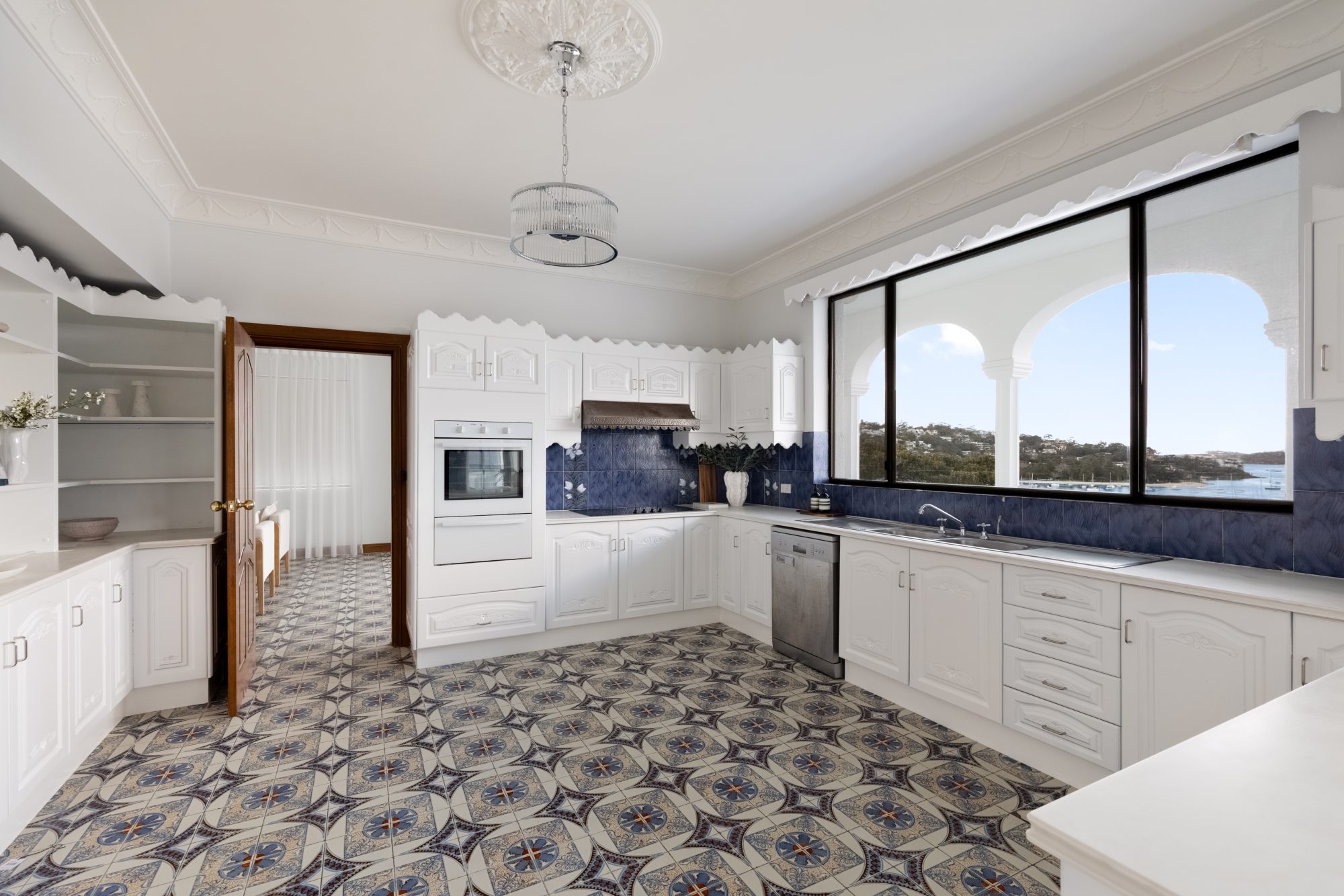 Enormous kitchen with decorative cabinetry, European tiled floor