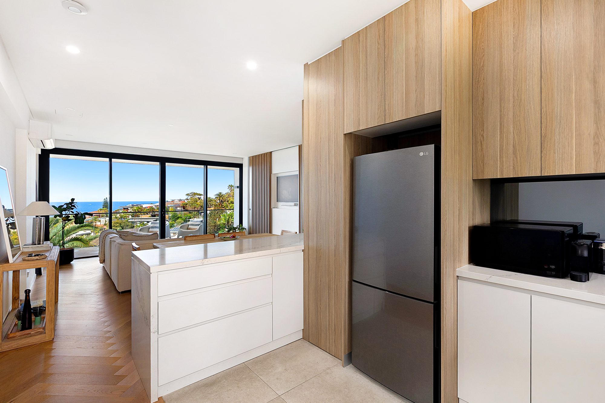 Set in the centre of the building, the open plan configuration enjoys natural light throughout the day. This newly renovated and wonderfully spacious, crisp and clean residence embodies laid back coastal sophistication with its elevated aspect amplifying light and views. Generous living space extends seamlessly to an entertaining balcony where there's nothing but an established palm tree adding to the beach and coastal views. Brand new level lift access from security parking with storage cage provides the ultimate convenience.
